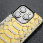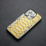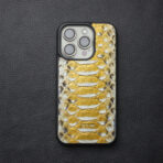 Crafted from A+ grade genuine python leather, this golden yellow phone case is accented with supple lambskin for an ultra-luxurious finish. The custom black shell is engineered with shock-absorbing protection, featuring raised edges and a slim, streamlined profile that fits effortlessly in hand. A soft interior lining safeguards your device, while the naturally varied python scales ensure that each case is a one-of-a-kind work of art.