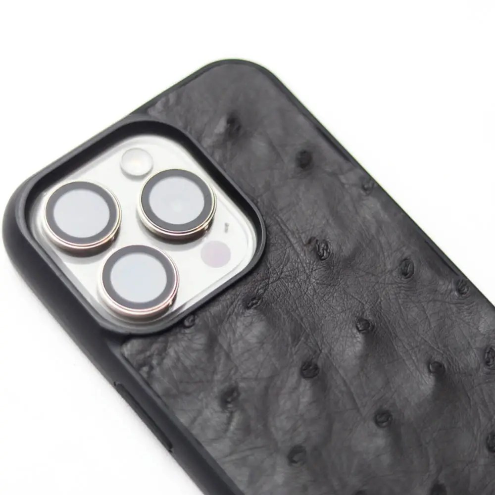 Protect your phone in style with this luxury A+ Grade Ostrich Skin case. The slim, shock-absorbing black shell features raised edges for enhanced protection, while a soft inner lining keeps your device secure. Finished with genuine ostrich leather, each case displays distinctive quill follicles—adding natural texture and timeless character to every unique piece.